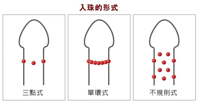 入珠一般分为,单点式,双点式,三点式,单排式,双排式,单环式,双环式,不规则式