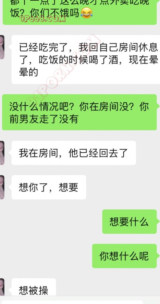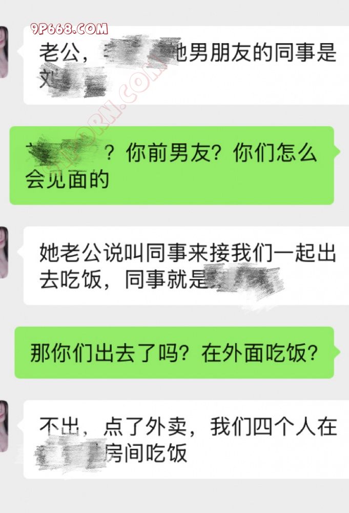 趁着暑假老婆跟同事外出旅游,加上老婆一共三个人,到了最后一站目的地的当天,其中一位同事(简称A)跟是男朋友(简称B)异地恋,老婆旅游的目的地就是这位同事老公所在的地方,另一位同事要去探亲,下了动车这位同事就跟老婆两人分开了,打算第二天跟老婆她们汇合。所以当晚的计划是同事A及她的老公B给老婆接风洗尘,(因为A是跟老婆一起来的,就一起定了同一家酒店,两间连着的房间)B将老婆跟同事A送到酒店之后打算休整一下就出门吃饭,老婆说在酒店的时候已经听到隔壁A跟B在打炮的声音了。傍晚的时候A跟B叫上老婆去吃饭,B说他的同事C接她们出门吃饭,一起过来的还有B的同事C,C居然是老婆的前男友,见上面时老婆跟C都有点尴尬,只能跟同事A说两人是以前的同学,而A跟B听到后觉得大家都认识,而且老婆的同事A说坐了这么久的车都累了,要不就不要跑来跑去了干脆在酒店房间点外卖吧,还可以休息一下。于是ABC三人加上老婆就在A的房间点外卖解决晚餐,还点了几箱啤酒,四个人一遍聊天一边喝,很快就到了深夜,期间C抓到机会就夸老婆读书的时候是多漂亮多校花,是多少人的白月光,老婆说吃饭期间C一直盯着她看,喝到后面老婆已经有点上头了,趁着AB两人下楼买烟的间隙。C跟老婆说这些年有多不容易,有多想老婆。说自己感情不顺,说着说着眼眶都湿了(其实都是演的,千言万语就是想上床…),老婆也有一点触动。等到AB回来之后,老婆说自己喝多了先回房间休息,而C也称自己不当电灯泡也要走了,老婆就回到房间休息,没想到C走了之后又返回来,在老婆房间门口给老婆打电话,问老婆能不能再聊聊天,老婆也察觉到C对她有想法,就给我发了信息,下面是聊天记录